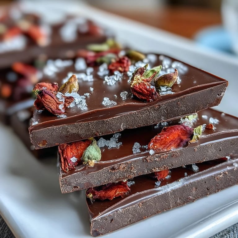 This recipe is wonderfully adaptable to your preferences and what you have on hand. For extra visual appeal and flavor contrast, drizzle melted white chocolate over the dark chocolate base before adding toppings. If pistachios aren't available, substitute with chopped almonds, hazelnuts, or even macadamia nuts. You can replace freeze-dried strawberries with other freeze-dried fruits like raspberries, blueberries, or mango for different flavor profiles. For a more intense floral note, add a drop of rose water to the melted chocolate. If you prefer a less sweet version, use 85% dark chocolate and reduce the fruit toppings slightly. Vegans can easily adapt this recipe by choosing dairy-free dark chocolate.