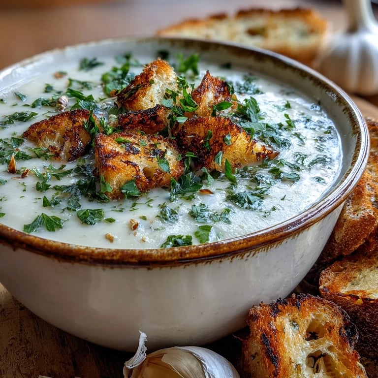 Save to Pinterest There's something almost magical about roasted garlic—the way it transforms from sharp and pungent into something impossibly sweet and creamy. I discovered this soup on a grey November afternoon when my neighbor mentioned offhandedly that she'd been roasting garlic heads by accident, thinking she was making something entirely different. Instead of tossing them, she threw them into a pot with cream and broth, and somehow created something I couldn't stop thinking about for weeks.