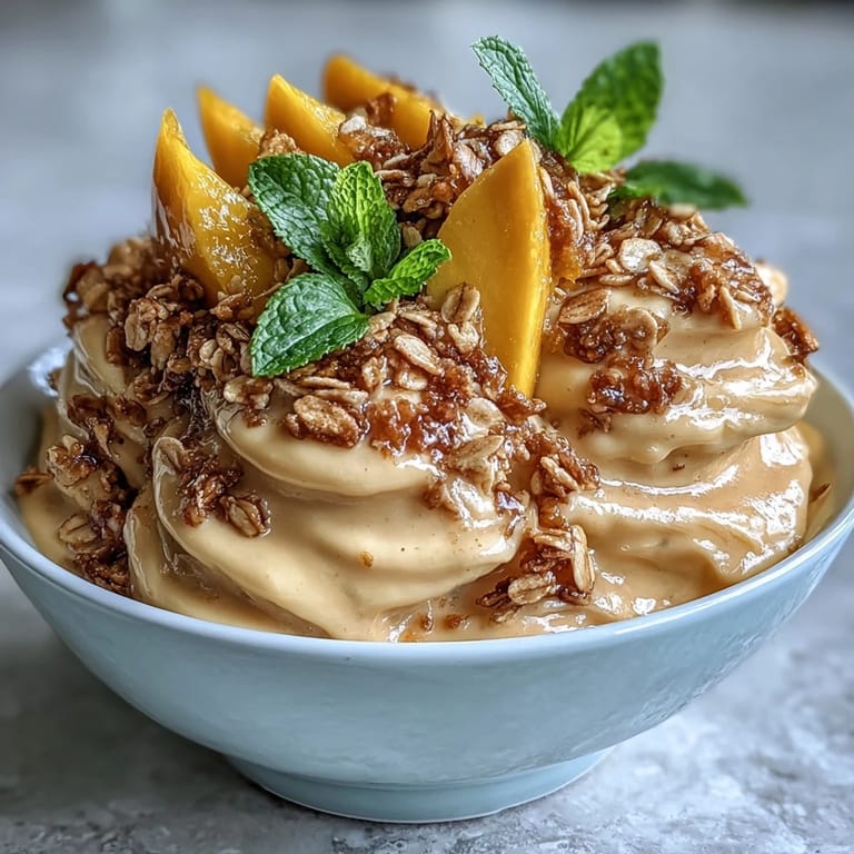 - Scoop the frozen mango mixture into bowls while it's still slightly soft, then pile on those toasted oats, fresh mango slices, and mint if you're feeling fancy. Serve right away before the ice cream melts into submission.